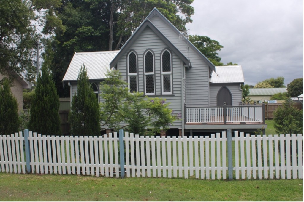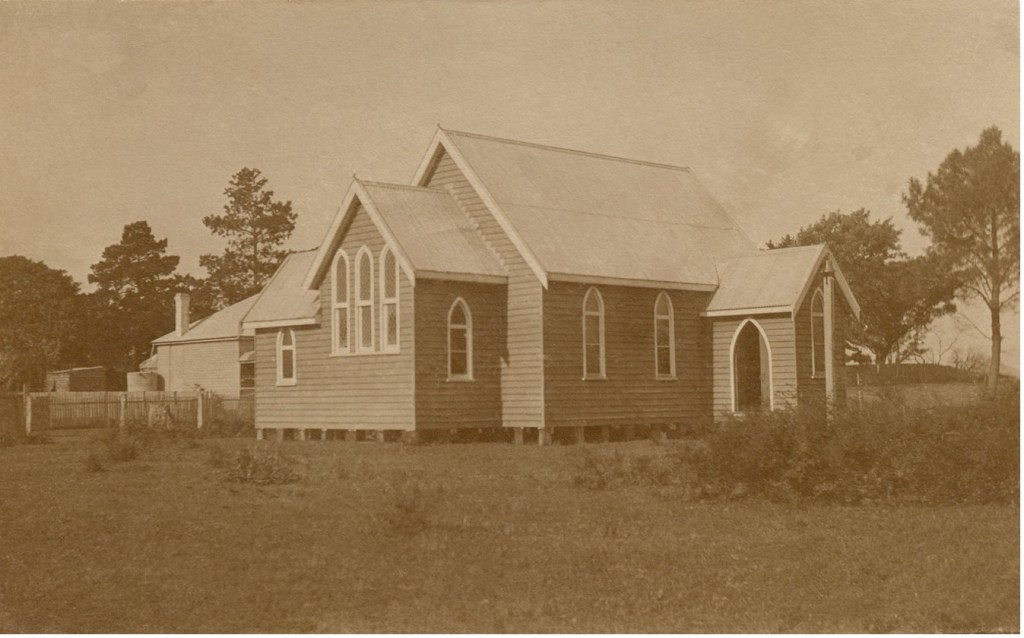 ‘This church was dedicated by the Bishop of Newcastle on the 9th December 1910. Prior to this, services were held in Witt’s Hall by the Revs. Perry, Rushforth and R. G. Knox. Mr. H. [Heinrich] Kuss did a lot of work in clearing the ground for the building which was erected by Mr. E. Yates, whose daughter’s wedding, to the late Mr. G. W. Engel was the first to take place in the church.