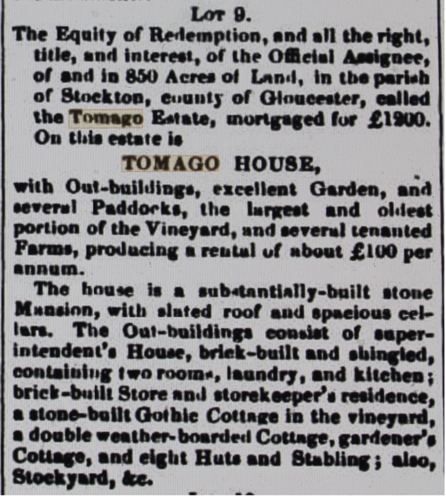 The following advertisement for Lot 9, which comprised 850 acres of land and Tomago House, in the County of Gloucester, was published in the Maitland Mercury and Hunter River General Advertiser, on 9 August 1848: