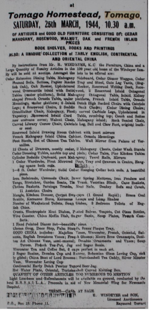 The Newcastle Morning Herald and Miners’ Advocate of 27 March 1944, page 2, also reported on the sale of the Tomago House contents: