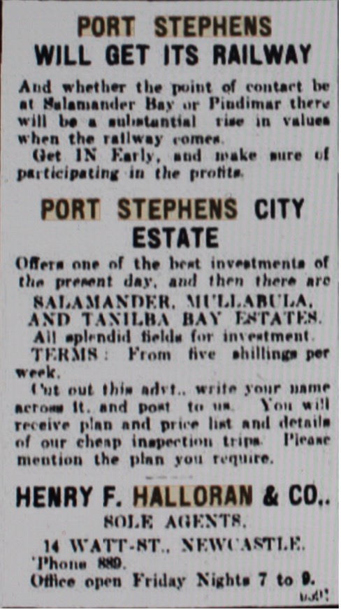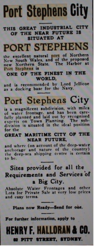 ‘Messrs. Henry F. Halloran & Co., of Sydney, announce that they have land to sell at Port Stephens, comprising three miles of water frontages. Liberal terms are offered’.