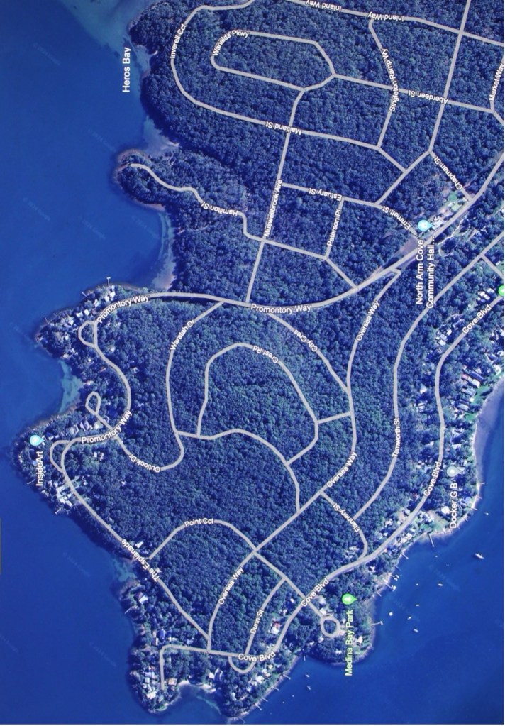 Google Maps still displays the named roads of the Halloran subdivision plan for the North Arm area. Most of the roads displayed have not been developed. [2024].