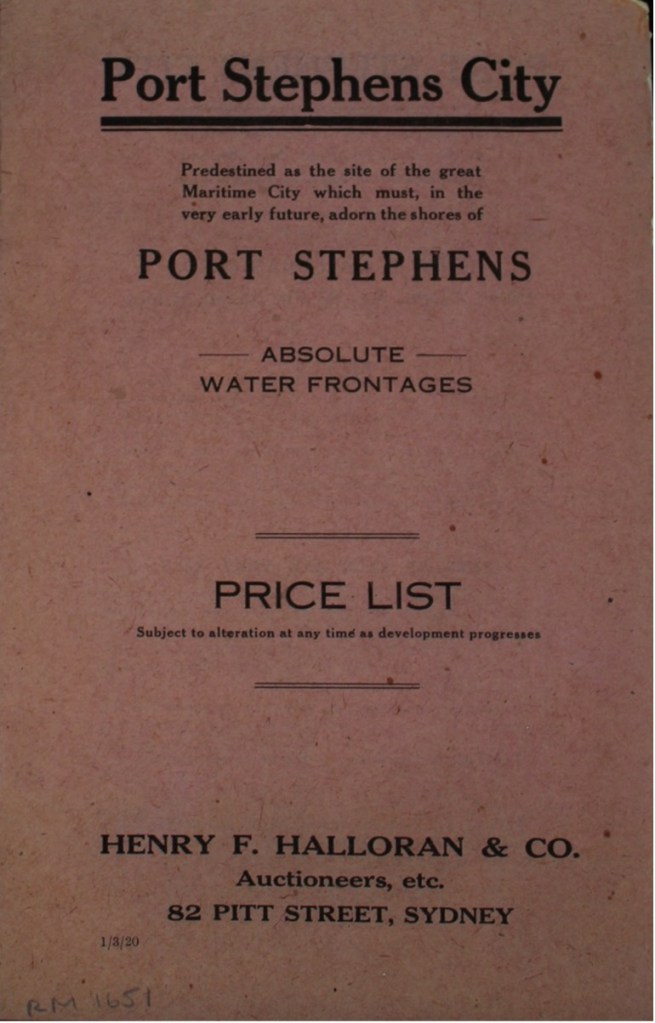 Cover of the price list for the Port Stephens City, ‘predestined as the site of the great Maritime City which must, in the very early future, adorn the shores of Port Stephens’ [National Library of Australia]