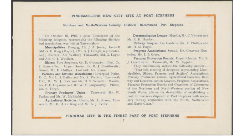 The leading harbor experts of the Commonwealth also expressed decided opinions on the matter. …. On October 16, 1918, a great Conference …. was held at Tamworth. … They unanimously carried the following motion: — “That this meeting of delegates representing Municipalities, Shires, Farmers and Settlers’ Associations, Primary Producers’ Unions, Agricultural Societies, Railway, and Decentralisation Leagues, Progress Associations, Pastures Protection Boards and Chambers of Commerce of the Northern and North-Western portion of New South Wales, affirms the desirability of establishing a port for overseas shipment at Port Stephens with necessary railway connection with the North, North-West and North Coast.”