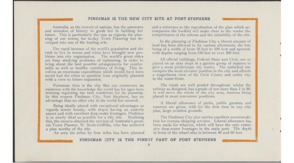 ‘The Pindimar City plan has been designed by a clever town planning engineer, who had the whole of the successes of history to guide him, and with a site almost unequalled for glory of outlook. The view from the estate presents a magnificent panorama through the distant commanding Port Entrance Heads, and takes in a wonderful stretch of water-way. It is the first city plan in Australia to include facilities for aviation possibilities in future commerce. A fine road is being made along Peace-avenue, to link up Pindimar City site with existing railway systems, whilst a fine accommodation house has been planned for visitors.