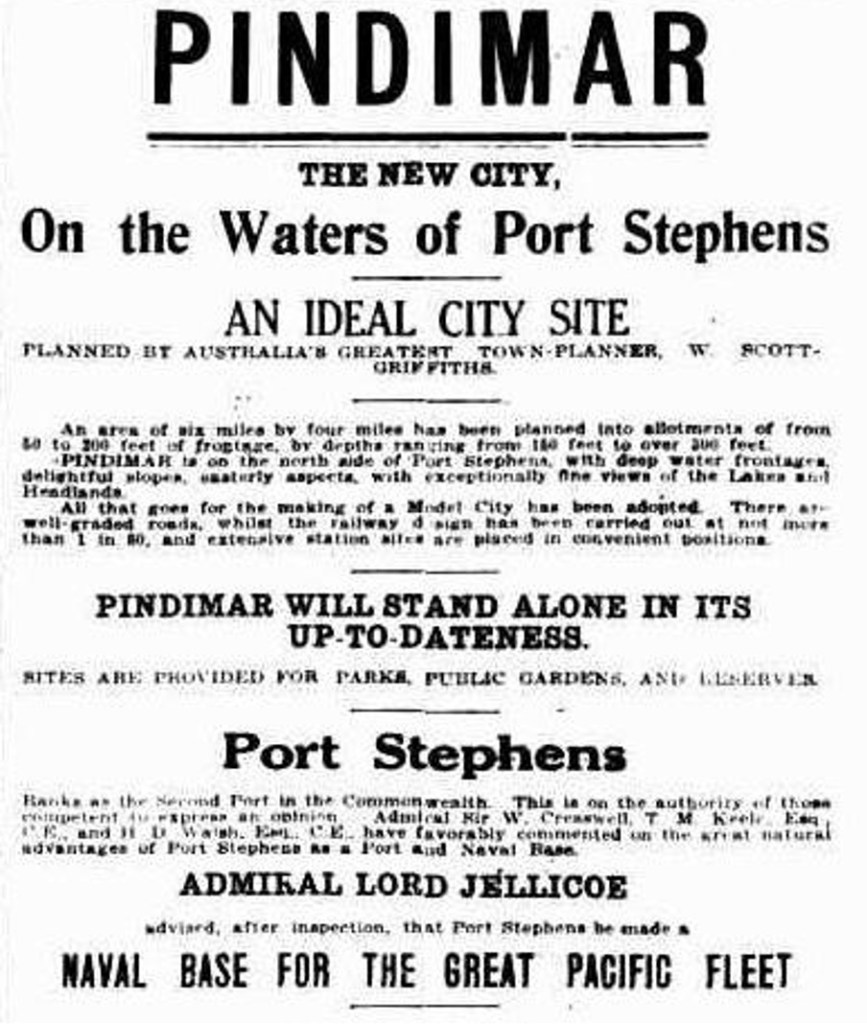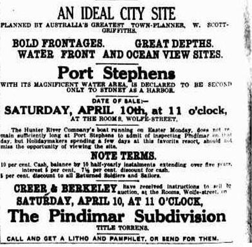 ‘The Pindimar town plan prepared by Mr. W. Scott Griffiths covers an area of six miles by four. Liberal allowance has been made in the various allotments for the subdivision sale to be conducted by Messrs. Creer and Berkeley on April 17. The widths vary from 50 feet to 100 feet, and depths range from 150 feet to over 300 feet. The reservation for official buildings in the centre of the city is on an easy slope in a garden group of squares, while the site for a cathedral is elevated, affording a magnificent view of the entire city area to the water front. A special feature of the layout is the naming of the streets. There are three subdivision areas, Dalley, Monash and Anderson, and in nearly all cases the street names commence with the same initial letter as the suburb in which they are placed. The city area is divided into commercial, residential and other sections, so placed as to give the utmost saving of time and the fullest conveniences. It is on the north side of Port Stephens, and may easily be linked with the main northern and north-western lands, and the adjacent water is from 60 to 90 feet deep.’