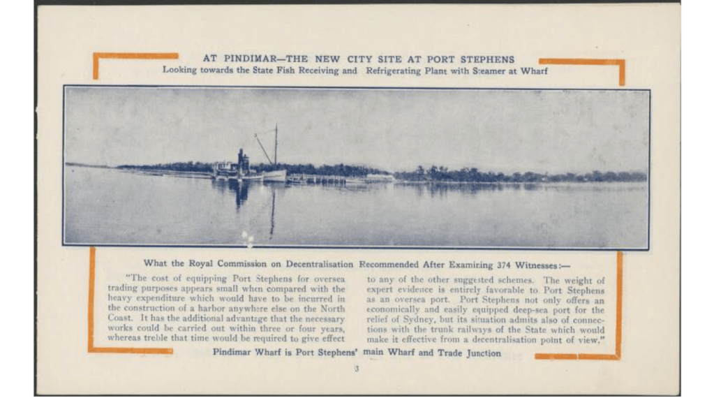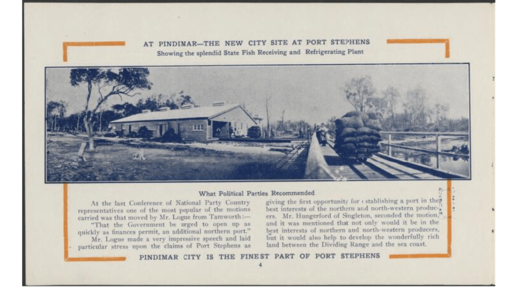 If developed, Pindimar would become the third largest city in New South Wales. At this time, the only development at Pindimar was the Fish Processing Factory, that had been established by the NSW Government in 1917.