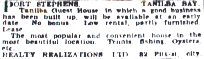 “Tanilba House” apparently became vacant again in 1850, for the Maitland Mercury of July 6 1850 carried the following advertisement: