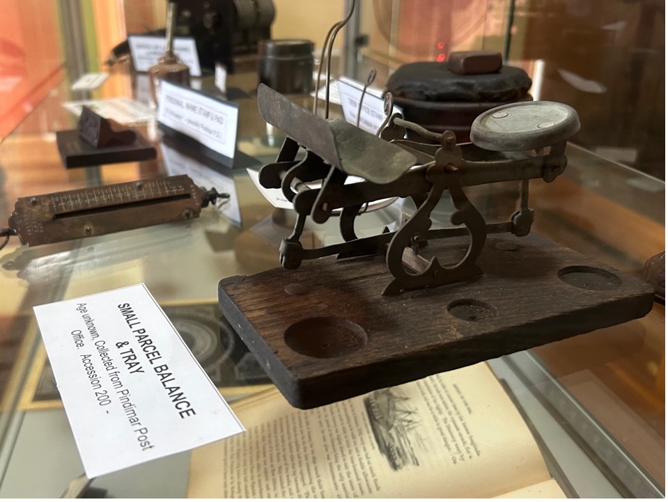 Small Parcel Balance and tray (foreground) and a large stamp pad (behind on right) which were formerly in use at the Pindimar Post Office [on display at the Inner Lighthouse Museum, Nelson Bay].