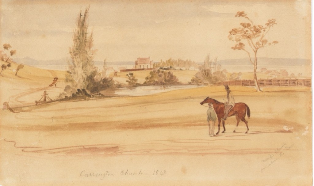 Painting of Carrington Church, from above the dam, 1848 [State Library of NSW]