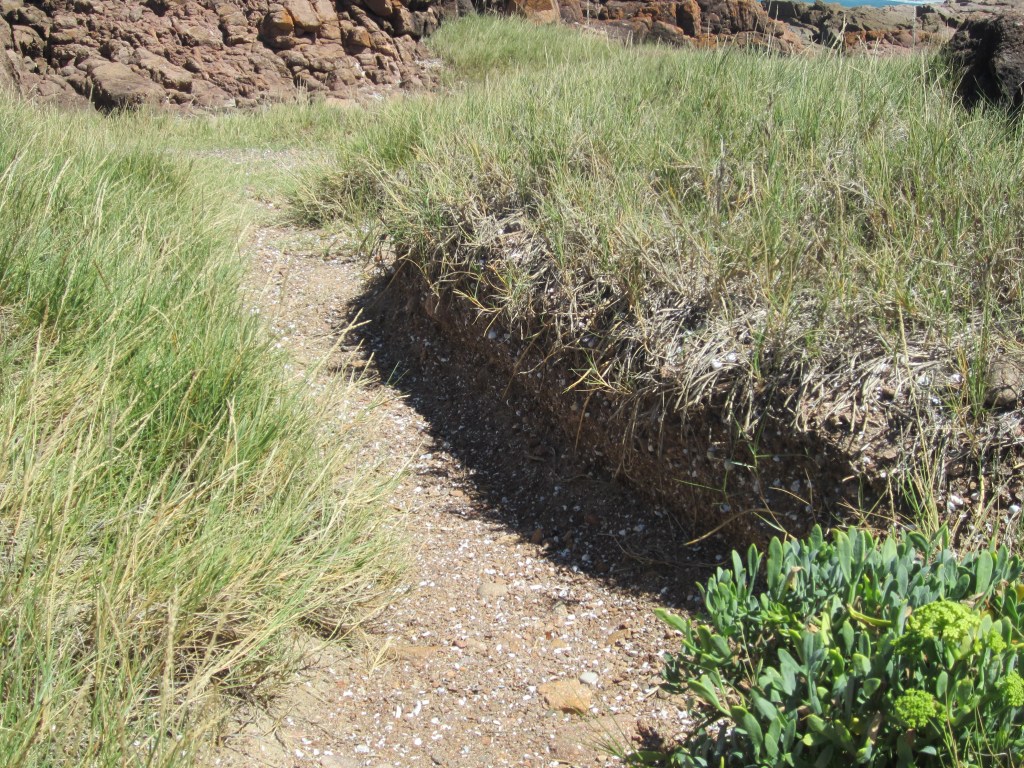 An embankment on the walk showing an exposed midden [Author Photo – 2023]