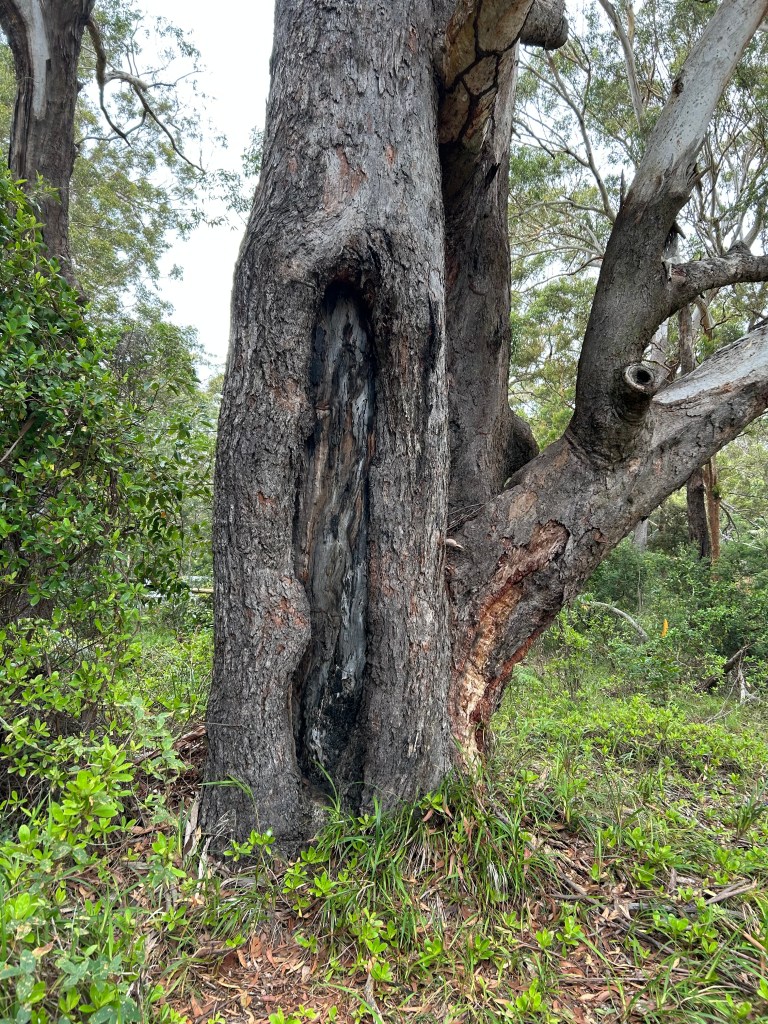 The old blackbutt tree at Little Beach showing how bark has been stripped to be formed into a shield or small canoe [Author photo – December 2024].