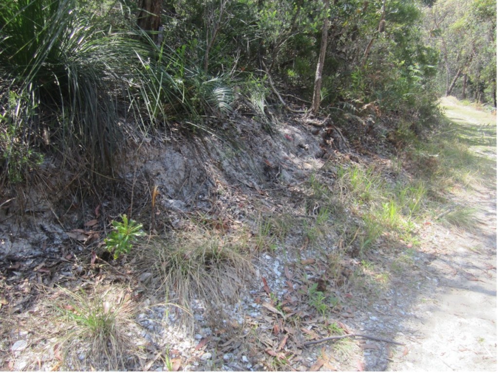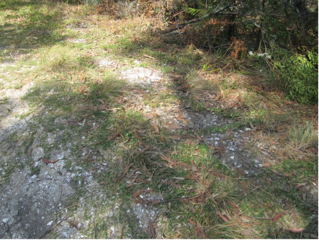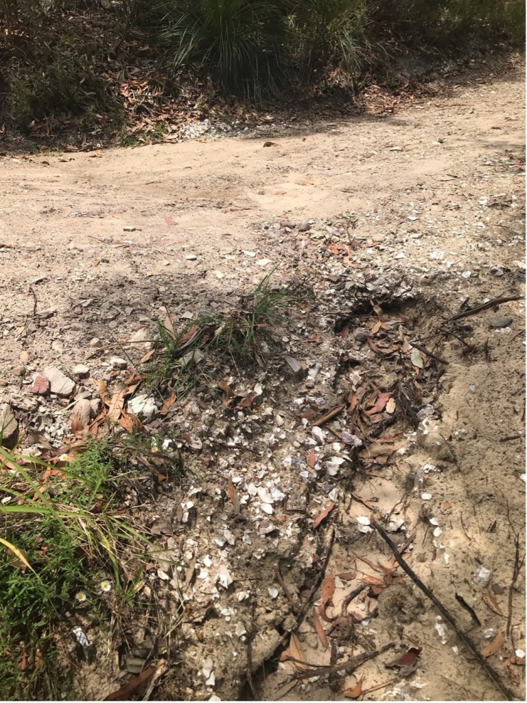Midden at the entrance to the fire trail, at the end of Joleen Crescent, Shoal Bay [ Author Photo – 2023]