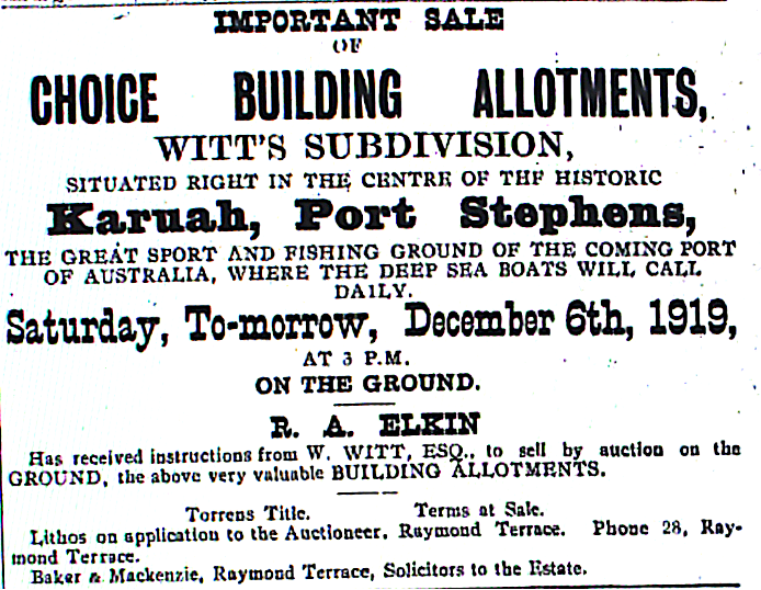 First advertisement for the sale of residential land in the Witt’s Subdivision at Karuah, published in the Raymond Terrace Examiner and Lower Hunter and Port Stephens Advertiser of 5 December 1919, page 3. The land was later featured in the Newcastle Sun article of 1 September 1922 that is featured above.