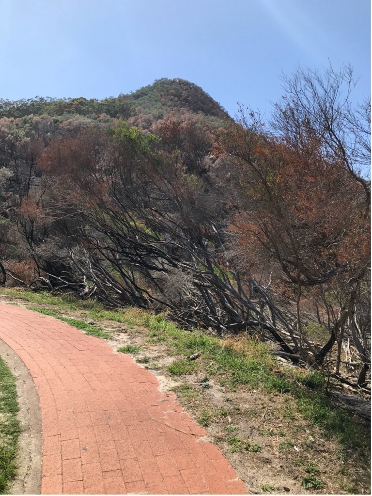 The following photos were taken on a walk to the summit of Mt Tomaree a month after the fire, showing the burnt vegetation: