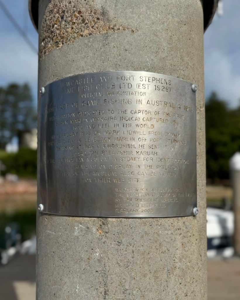 Newcastle and Port Stephens Game Fish Club Ltd (established 1929) Official Weigh Station. Birthplace of Game Fishing in Australia 1913. Weigh Station  dedicated to the captor of the first Black Marlin (Makaira Indica) captured on rod and reel in the world.
