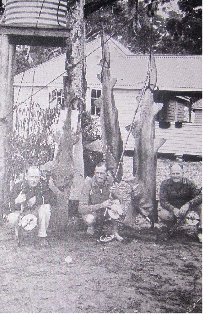 [Left to right] Athel D’Ombrain, Newman Silverthorne, Sil Rohu. The first big game catches of 1935 at Shoal Bay were two grey nurse sharks and a wobby-gong. The new clubhouse is in the background [Newcastle University Living Histories collection]