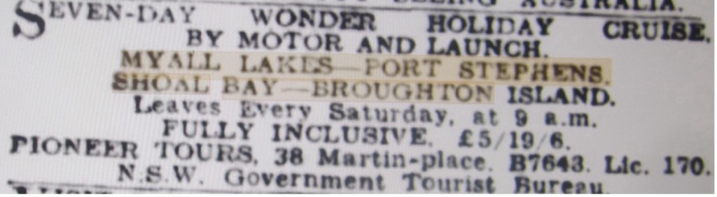 “Preference is to be given to club members who require accommodation,” the Newcastle Publicity Director (Mr. Cahill) said today, “but tourists will also be accommodated. The whole idea is to organise the tourist facilities there, and the scheme will bring Port Stephens into line with the leading fishing resorts of the world.” Mr. Cahill conferred with the organiser of the scheme (Mr. Raper), who is now in Newcastle, and who hopes that the project will appeal particularly to big-game fishermen in this area. “The facilities being provided,” Mr. Raper said, “are badly needed by big game fishermen who like fishing at Port Stephens”.