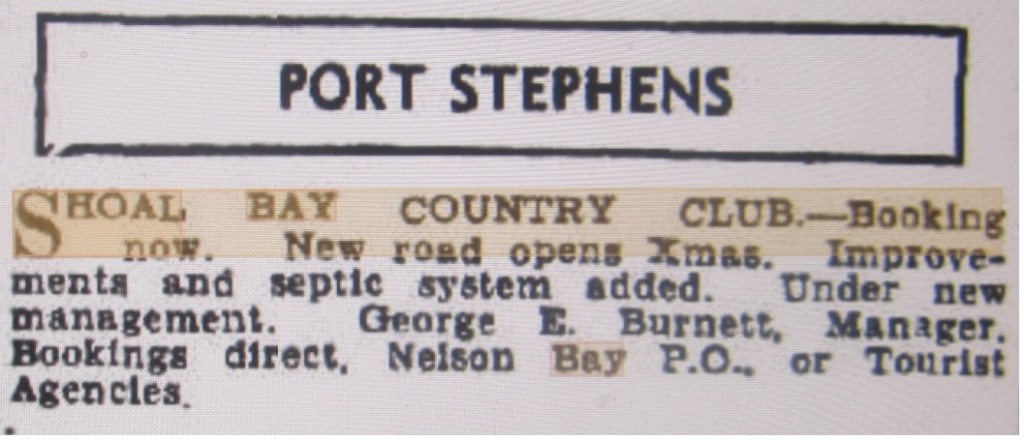 ‘Shoal Bay Country Club, at Nelson’s Bay, asked the Council to improve the road to the property. The club was spending a good deal of money on improvements and asked that it receive some support in this way. The engineer was instructed to inspect the place.’