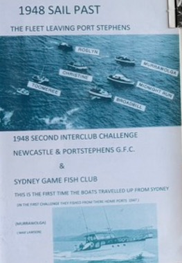 Publicity for the sail past of fishing vessels that participated in the 1948 second interclub challenge. Boats pictured are (left to right): Toomeree, Christine, Roslyn, Broadbill, Midnight Run, and Murrawolga [as displayed in the foyer of the Game Fish club, Shoal Bay]