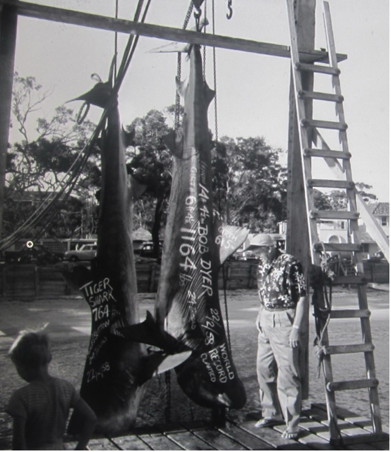 Bob Dyer with 1164lb world record tiger shark – 22 February 1958 with the rebuilt Shoal Bay Country Clubhouse in the background [Newcastle University Living Histories collection]