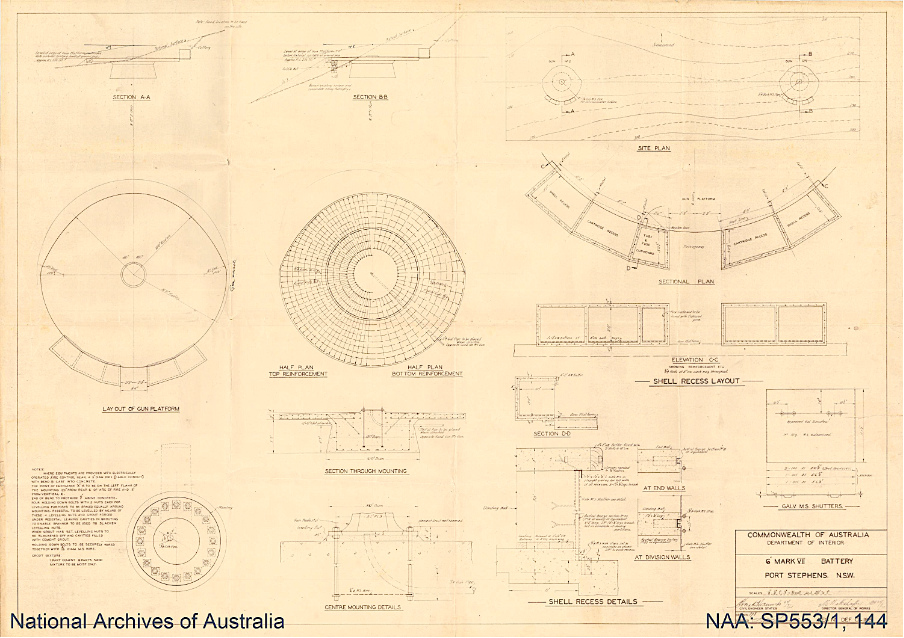 Plan for the two 6-inch Mark VII B gun emplacements and associated infrastructure at the Tomaree Battery, prepared by the Commonwealth of Australia, Department of Interior [National Archives of Australia]