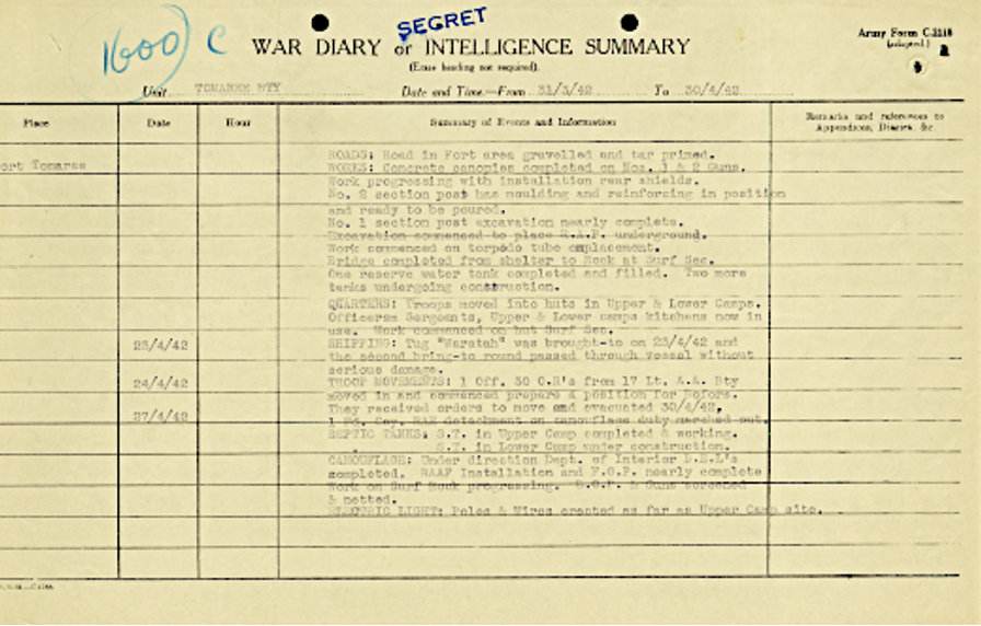 The Australian War Memorial in Canberra holds the War Diary for the Tomaree Battery Coastal Artillery Battery at Shoal Bay, Port Stephens, for the period March 1942 to February 1944.