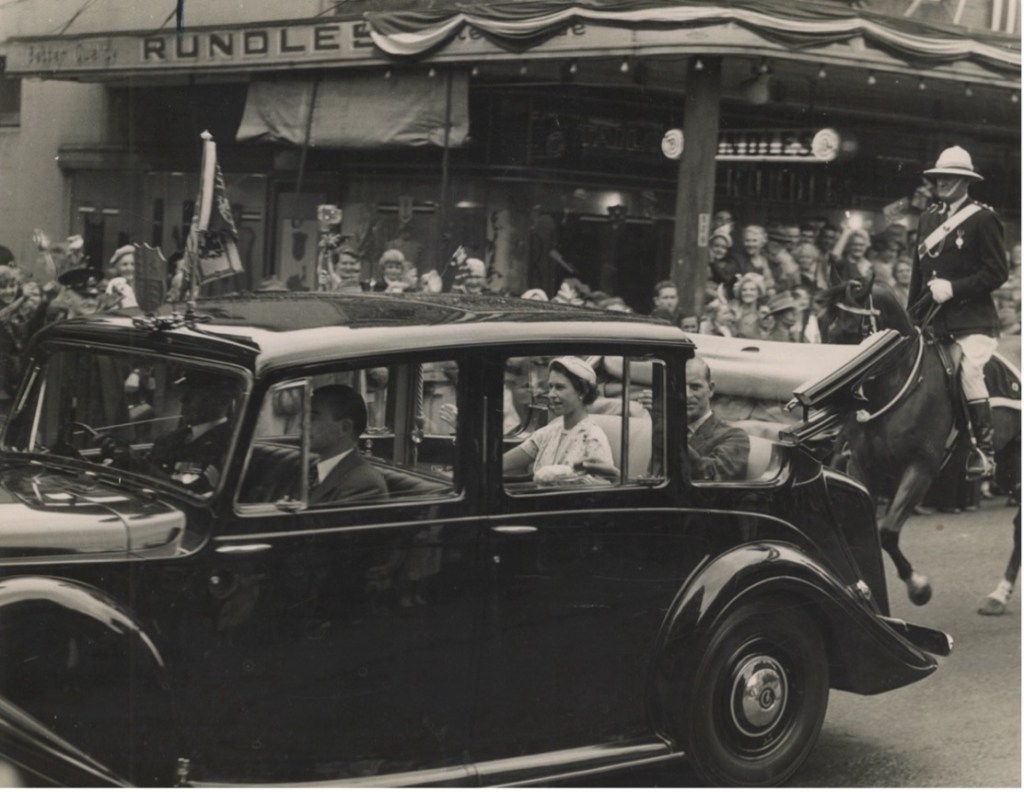 A crowd of over 400 lined the road from end to end of the township, which was decorated along its entire, length. At 4.40 p.m. the Royal Procession was seen approaching at speed, and everyone in the crowd waved and cheered, and Her Majesty’s car did exactly what the people had hoped for, — it slowed down to about ten miles per hour and Her Majesty smiled and gaily waved to the happy throng. Very few saw the Duke of Edinburgh who was partly obscured in the closed car but the smiling face of our Queen will not be forgotten by the adults and children of Fern Bay, the first country township to be seen by the Royal visitors, in Australia on a car trip.’