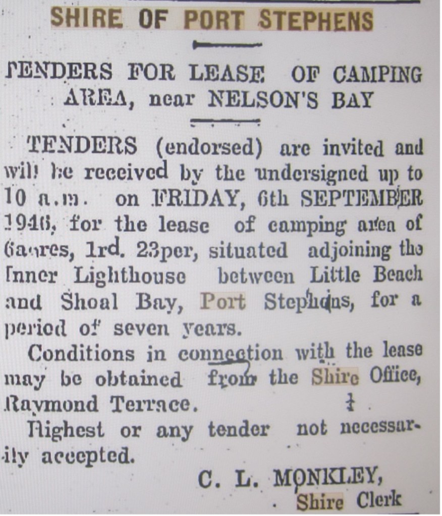 In August 1946, the Port Stephens Shire Council advertised for tenders for the lease of a camping area near Nelson Bay. The Council published the following advertisement.
