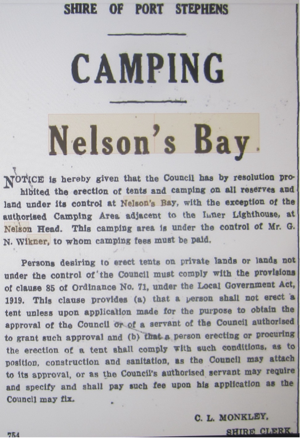 ‘Cr. Morgan said he had seen Mr. Wikner and discussed the camping around Nelson Bay. Mr. Wikner made no secret of the fact that he had invested a large sum of money to provide suitable camping facilities. He had the idea of a monopoly in the area. It was galling to see campers just outside his gate. We have no jurisdiction over some lands. The only way to supervise camping is to pay someone to police the area. The Health Inspector cannot be there all the time. A uniformed man would make a greater impression. We must do something this summer to show the Council is concerned in the control of campers. Mr. Conroy said Council can prevent the erection of tents. The Shire Clerk, (Mr. Monkley), in reply to a question said a caravan can camp anywhere. They are considered motor vehicles as far as the law goes.