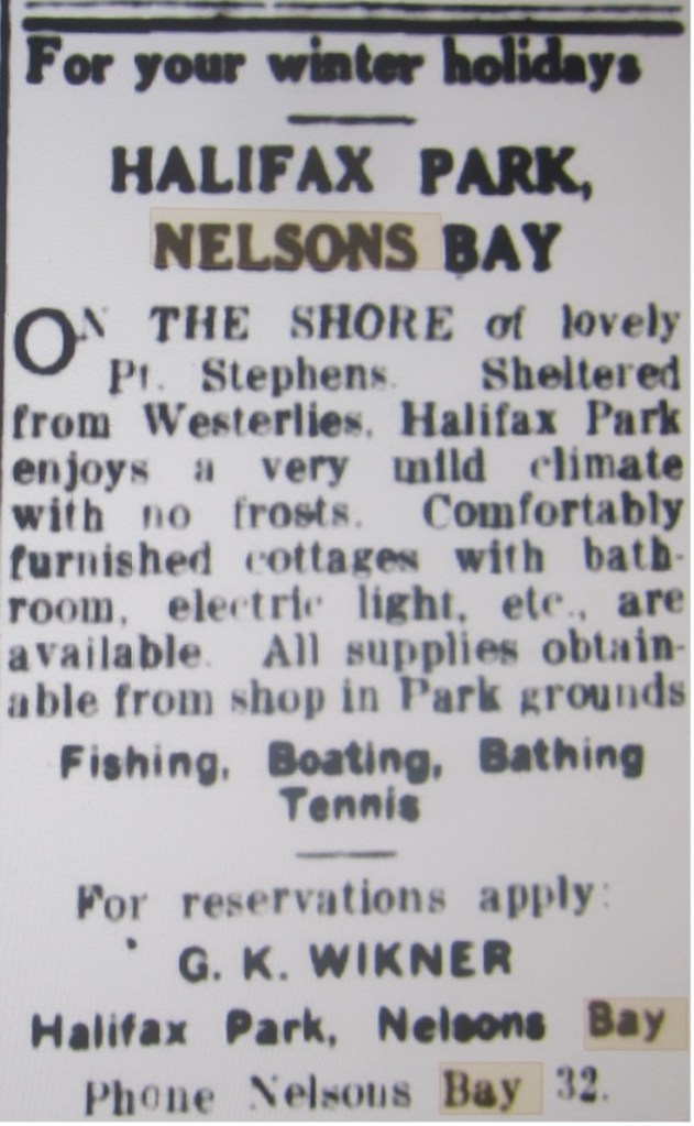 ‘About 500 visitors were camped at Halifax Park, Nelson Bay, last night. The proprietor of the park (Mr. G. N. Wikner) said most of the visitors spent the day fishing and swimming. The children went for pony rides. About 75 carloads of people visited Nelson Bay for the day. Wikner said visitors to Halifax Park would have their Christmas tree to-night, when most visitors would have arrived.’