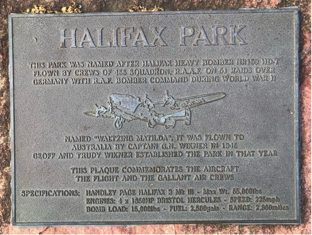 The history of Halifax Park and Geoffrey Wikner’s Halifax aircraft is found on the commemorative plaque located at the entrance to the park.