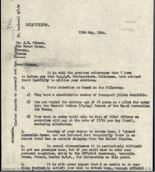 Letter dated 19 May 1944, rejecting Wikner’s application to join the Australian Ferry Company [National Archives of Australia]