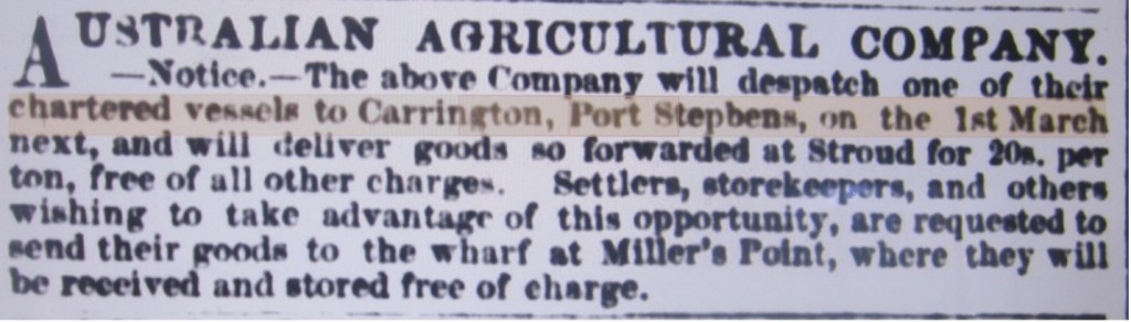 The first advertisements were placed by the Australian Agricultural Company which had established operations at Carrington in 1826, on the northern shore of Port Stephens.