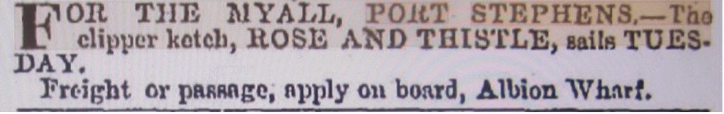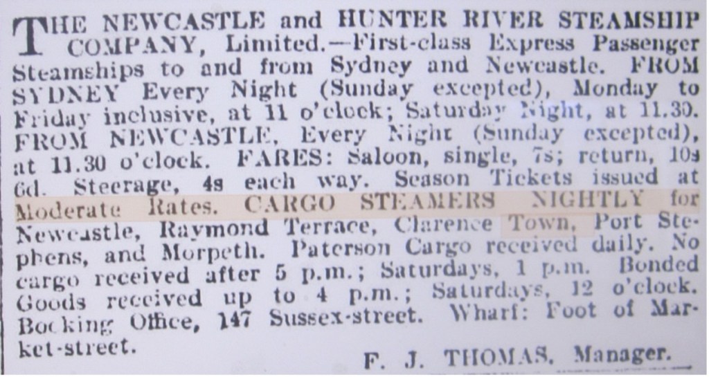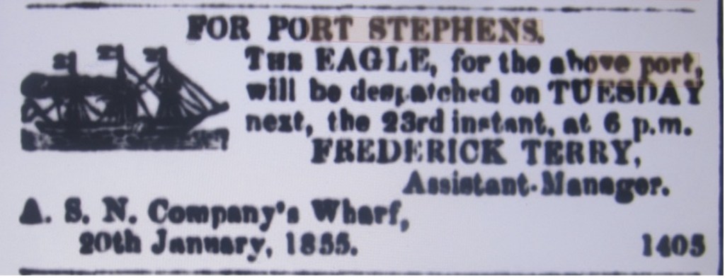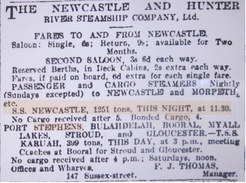 The following advertisements, placed by various shipping operators in the period 1854 -1929, are indicative of the options for travel and cargo movements to and from Port Stephens in these early years.