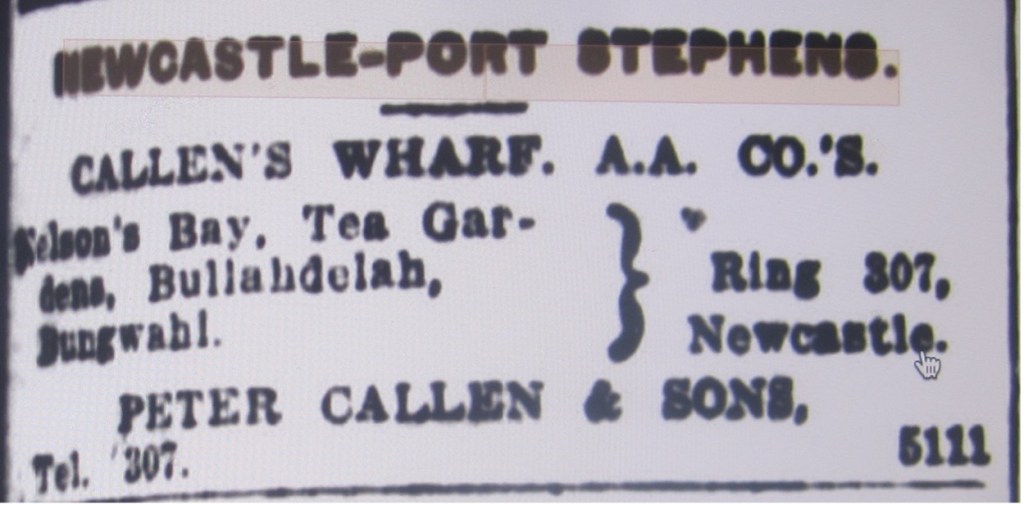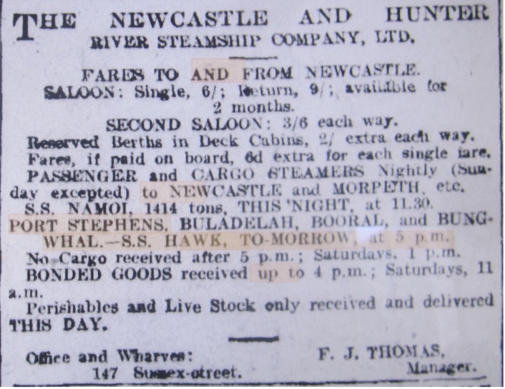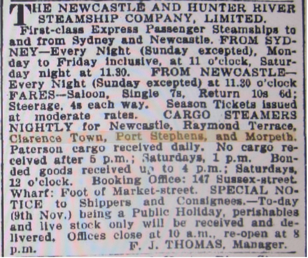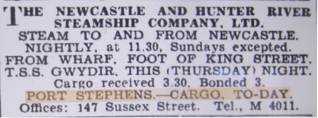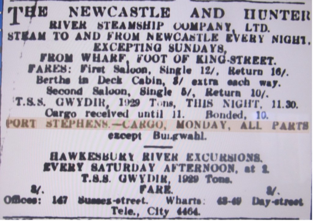 Before 1930, travel and cargo movements from Sydney or Newcastle to Port Stephens were mostly done by steamship.