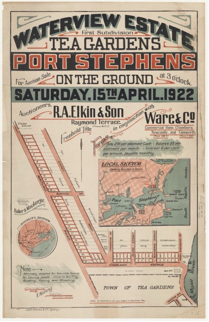 ‘The public are notified that Mr. R. A. Elkin is in town selling blocks on the beautiful Waterview Estate, Tea Gardens…… Dungogites who want a block of land at Port Stephens where a magnificent holiday, fishing, shooting, etc., can be spent should get in early and secure a block.’