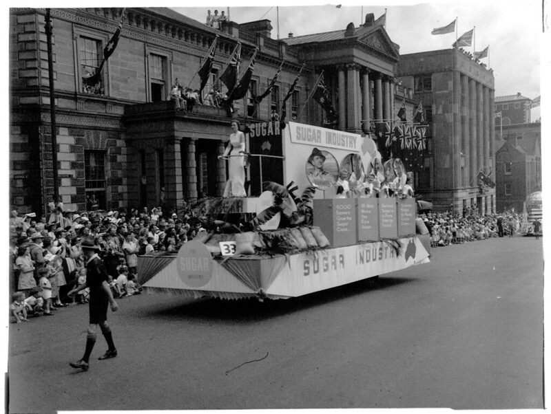 Federal and State members, parliamentary officials, their wives and families, crowded the balconies at Parliament House, where the Speaker (Mr. Lamb) and Mrs. Lamb welcomed official guests. A special cheer went up as the new Australians’ float, carrying new citizens in national costume and surmounted by Miss Australia enthroned, moved past. Former nationals of half-a-dozen European countries, all in gay traditional dress, followed on foot. People good naturedly booed and jeered a float called “50 Years of Progress with Electricity.’” There were shouted comments of “That will be the day.” ….