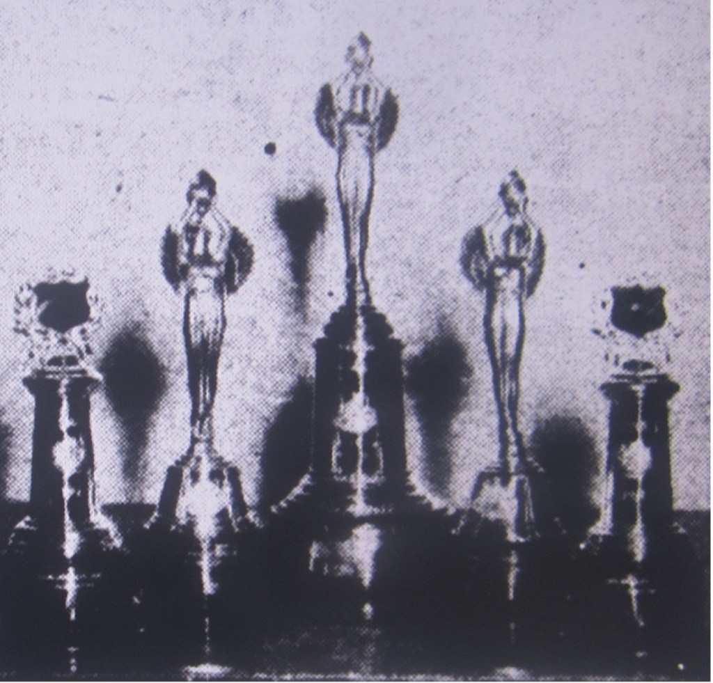 Trophies for the Jubilee Australian fishing championships. The large trophy in the centre is for the champion of champions and the other four are for the interstate teams competitions. The three middle trophies featured the golden angel over the Australian Coat-of-Arms [Newcastle Sun, 19 April 1951]