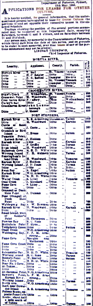 Applications for leases for oyster culture at Port Stephens [Sydney Morning Herald, 12 May 1885]