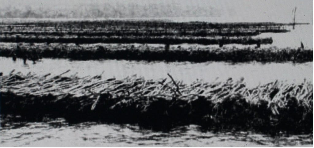 For oysters attach themselves readily to anything which fulfils their requirements, in these respects, and in the office of the Fisheries Department may be seen the shells of oysters (or photographs of them) attached even to bottles, dinner plates, and old boots, which had been cast into the water on the oyster grounds. ….. The most effective method is to lay-out on flats a plentiful supply of such like material at about half-tide mark at the period of the year when a fall of spat is about to occur; and at the same period in the following year to remove the material with the attached oysters to low-water mark, replacing the spat-collecting objects at half-tide mark.