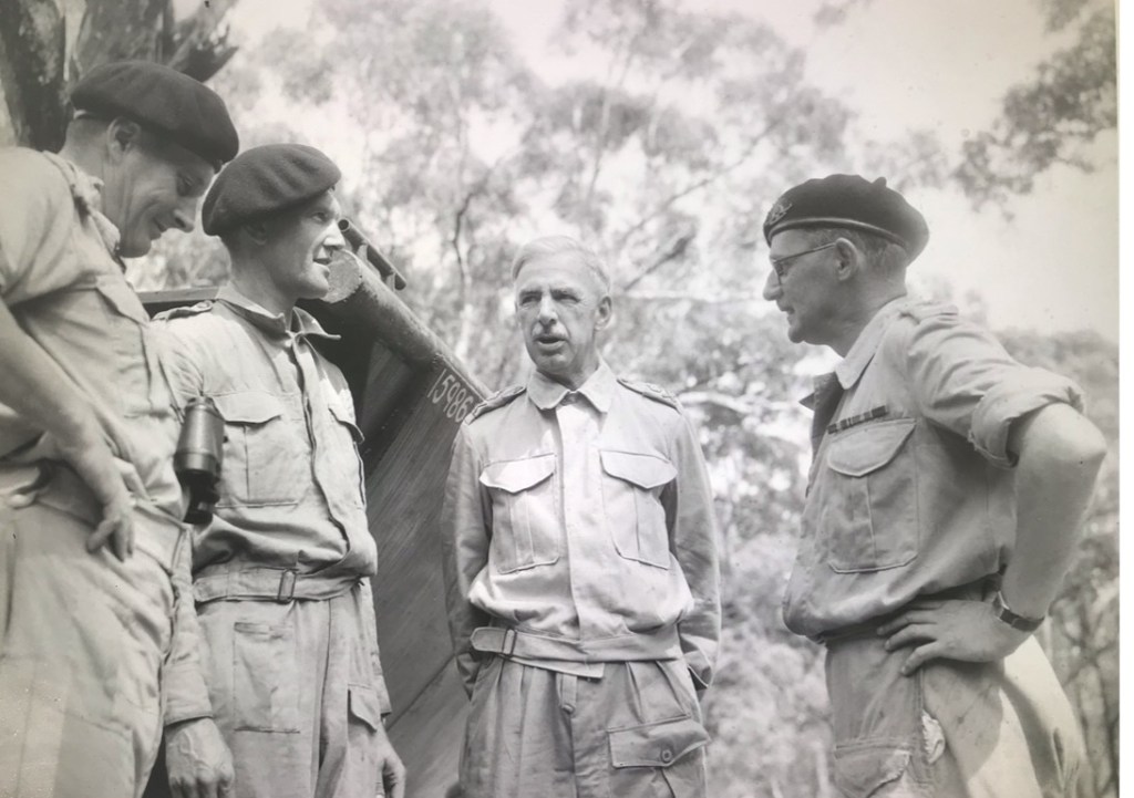 Returning from an inspection of the target area at Gan Gan, where troops of the Northern Rivers Lancers took part today in a practice shoot are Brigadier D. Macarthur Onslow (C.O. 1 Armored Brigade), Major E. A. Humphries (O.C. of the unit), Lieut. Gen. S. F. Rowell (Vice-chief of the General Staff), and Capt. V. J. Sharpe (O.C. Wireless Training Wing).