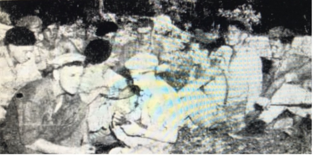 The camp ends today and most of the boys will be sorry. Their spell in the scrub, though it took in exhaustive training, has been—in their own words—”as good as a holiday.” One of the training highlights of the camp was a 14-hour simulated battle in the Gan Gan backwoods. Since the company’s Commanding Officer (Major E. E. Cottee) had suggested we might like to spend a day with the unit, we set out on Monday morning to see how the battle was going. We drove out through Stockton and Salt Ash with British-born Jim Blades, a “Newcastle Morning Herald” photographer, who served with the Fleet Air Arm in the North Atlantic and Pacific in World War II. ……
