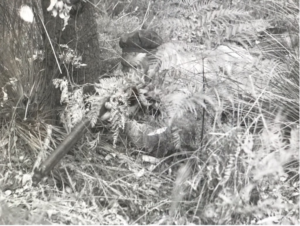 Crighton was sighted, under cover of a log. Sergeant Newton walk-ed across through the scrub to join him. The rest of us followed. “Seen anyone?” Sergeant Newton asked. “No.” The guide was supposed to arrive at 1200 hours. “What’s the time” Sergeant Scotman asked. “Has it gone 12 o’clock yet” “Yeah,” said the Sar-Major. “They can’t hear the City Hall clock from here.” “I wish this war would get mobile,” Sergeant Scotman said. We all crouched there, behind the log, with everything quiet except when we slapped at the invading mosquitoes and when the Mustangs came over. We could hear no sound of fighting. Trooper Brown idly pulled a large fern, and, just as idly, began stripping its leaves. He suggested we could all do the same, and he’d use the leaves to garnish the curried sausages. “I don’t suppose the guide can find us,” someone said. “