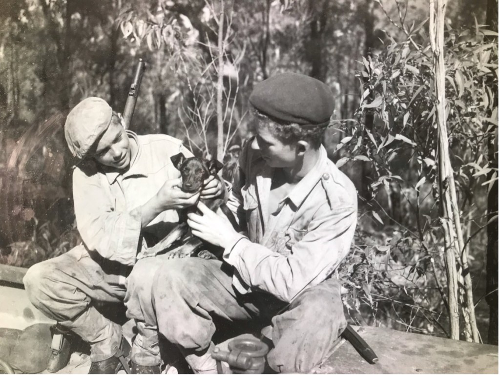 Cadet M. Daly, of Newcastle (left), and Trooper K. Dugan, of Fassifern, make friends with a young pup they found in the bush—and now their tank mascot.