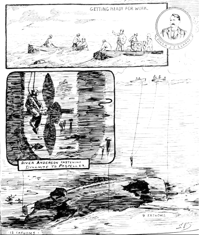 The Maud Weston was moored to the wreck, and three divers were employed in connection with the salvage work. Besides Captain Weston, the salvage party consisted of three divers and the vessel’s crew of 10 men. Operations were first directed to removing some submerged spars, which were knocking about dangerously close to the bottom of the Maud Weston. This wreckage being cleared away, about 100 tons of coal were removed from the wreck.