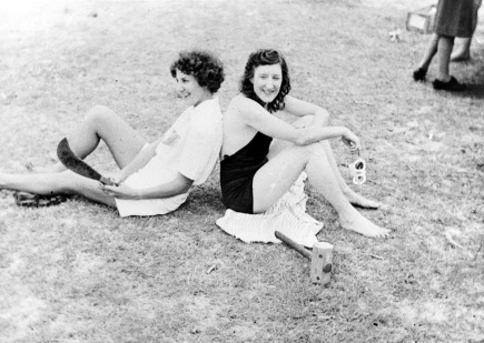 Signalwoman Hawkins (left) wields a machette knife as she and another member of the Australian Women’s Army Service (AWAS) relax