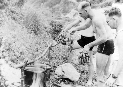 Lieutenant A. K. Marsh (centre) helping to prepare the lunch of boiled frankfurters
