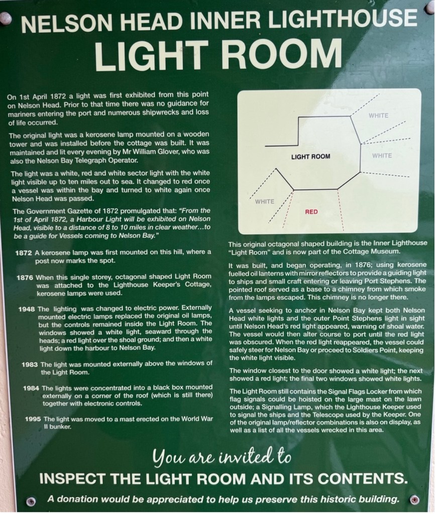 The Evening News of 15 October 1874, page 4, reported on a visit by the Marine Board that inspected the two Port Stephens Lighthouses. With regard to its visit to the Inner Light it was states that: