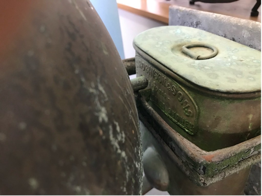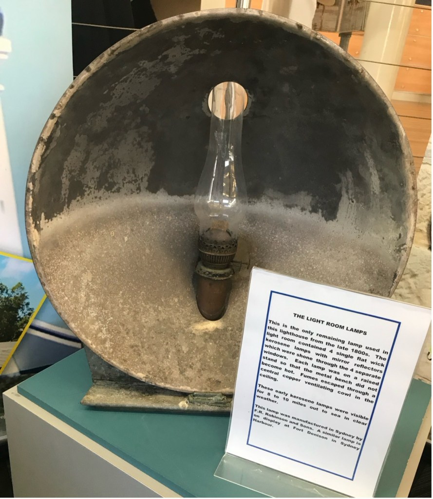 “This is the only remaining lamp used in this lighthouse from the late 1800’s. The light room contains 4 single flat wick kerosene lamps with mirror reflectors which were shone through the 4 separate windows. Each lamp was on a raised stand so that the metal bench did not become hot. Fumes escaped through a central copper ventilating cowl in the ceiling. These early kerosene lamps were visible for 8 to 10 miles out to sea in clear weather. This lamp was manufactured in Sydney by F. R. Robinson and Sons. A similar lamp is on display at Fort Denison in Sydney Harbour”.