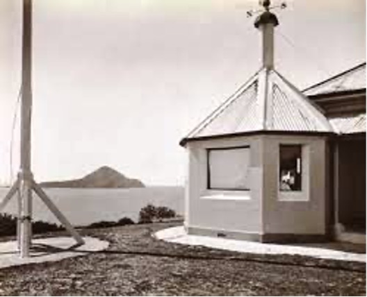 Inner Lghthouse with the lower part of the signal mast that was erected in January 1920 shown on the left of the photo. An air vent for the oil lamps in the light room is situated at the apex of the roof.